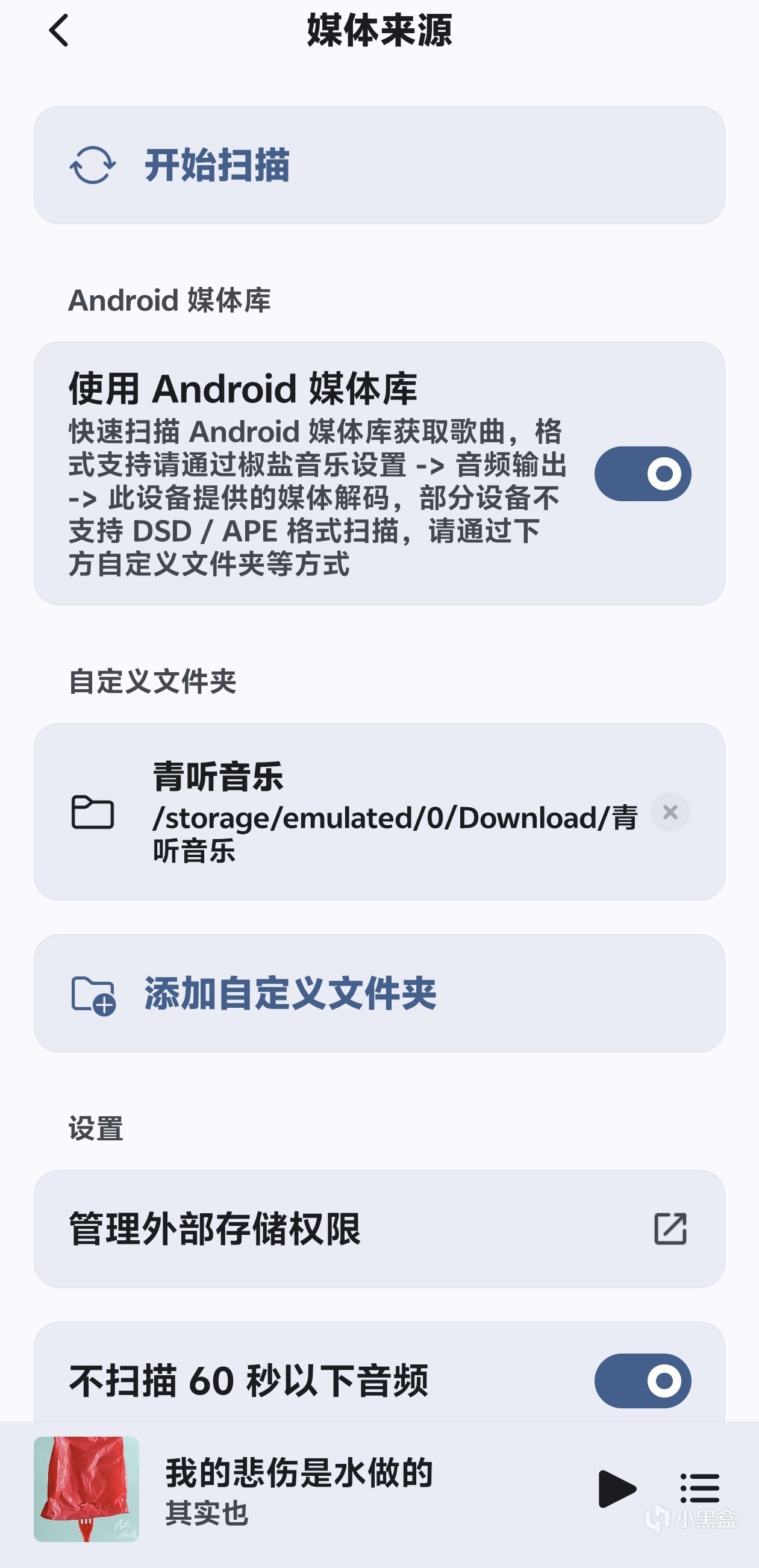 7.打開椒鹽音樂的側邊欄,選擇掃描音樂,添加自定義文件夾,選擇存放歌曲的文件夾,再點擊頂部開始掃描。