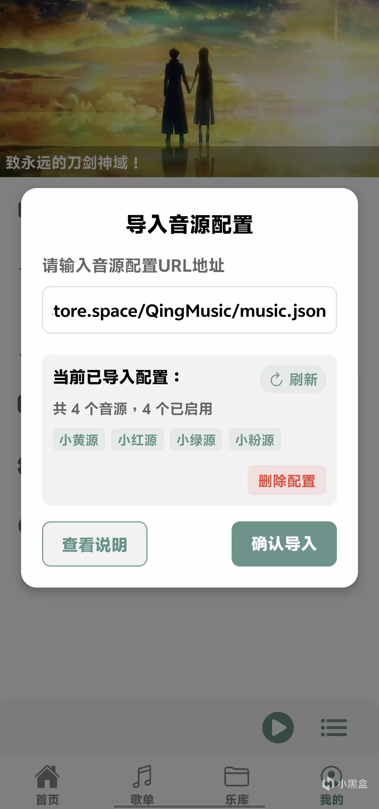 3.选择导入音源配置,输入以下URL:https://13413.kstore.space/QingMusic/music.json,并确认导入。