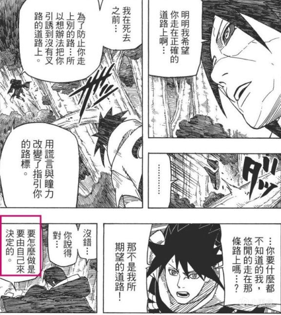 即便是在后面遇到了佐助,鼬也能坦然承认自己对佐助所做的一切——自己用谎言修改了佐助人生的路标,意图让佐助走在“正确”的道路上,但是那并不是佐助所期望的。