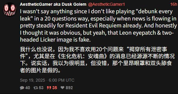 知名爆料人Dusk Golem也注意到了此泄露圖,稱戴眼罩的里昂與雙頭怪物是很明顯的假圖。