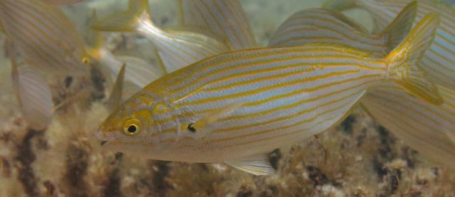 是一种鲷鱼,可以通过其身体上的金色条纹来识别,主要分布于东大西洋和地中海的温带和热带水域。
