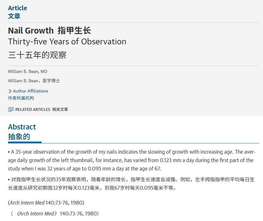 這個獎的獲得者叫William B Bean,從32歲起,他連續35年,雷打不動地在自己左手大拇指上刻下標記,就爲了測量指甲到底長得多快。