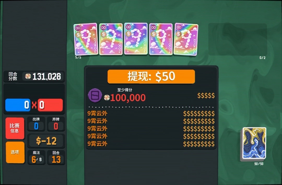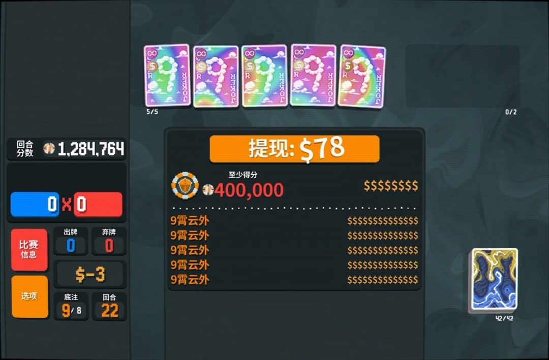 九霄雲外:每個回合結束時,你完整牌組內的每張9使你獲得$1(當前爲$0)