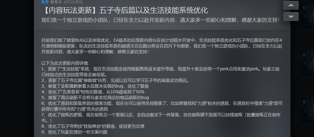 比如说灵兽江湖这款游戏,他的大部分更新都是针对于剧情的,游戏在美术和系统框架上,其实在ea刚刚发售的时候就已经基本上完整了,他们真正想要追求的是在开放世界一样的地图里面,能够让玩家体验到超高自由度的同时,各种随机任务也能让他们玩的开心。