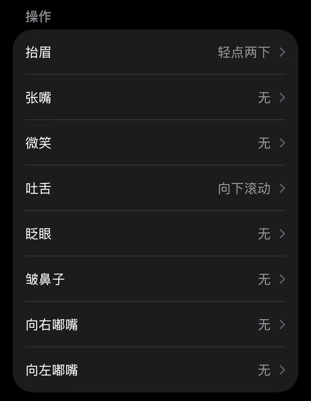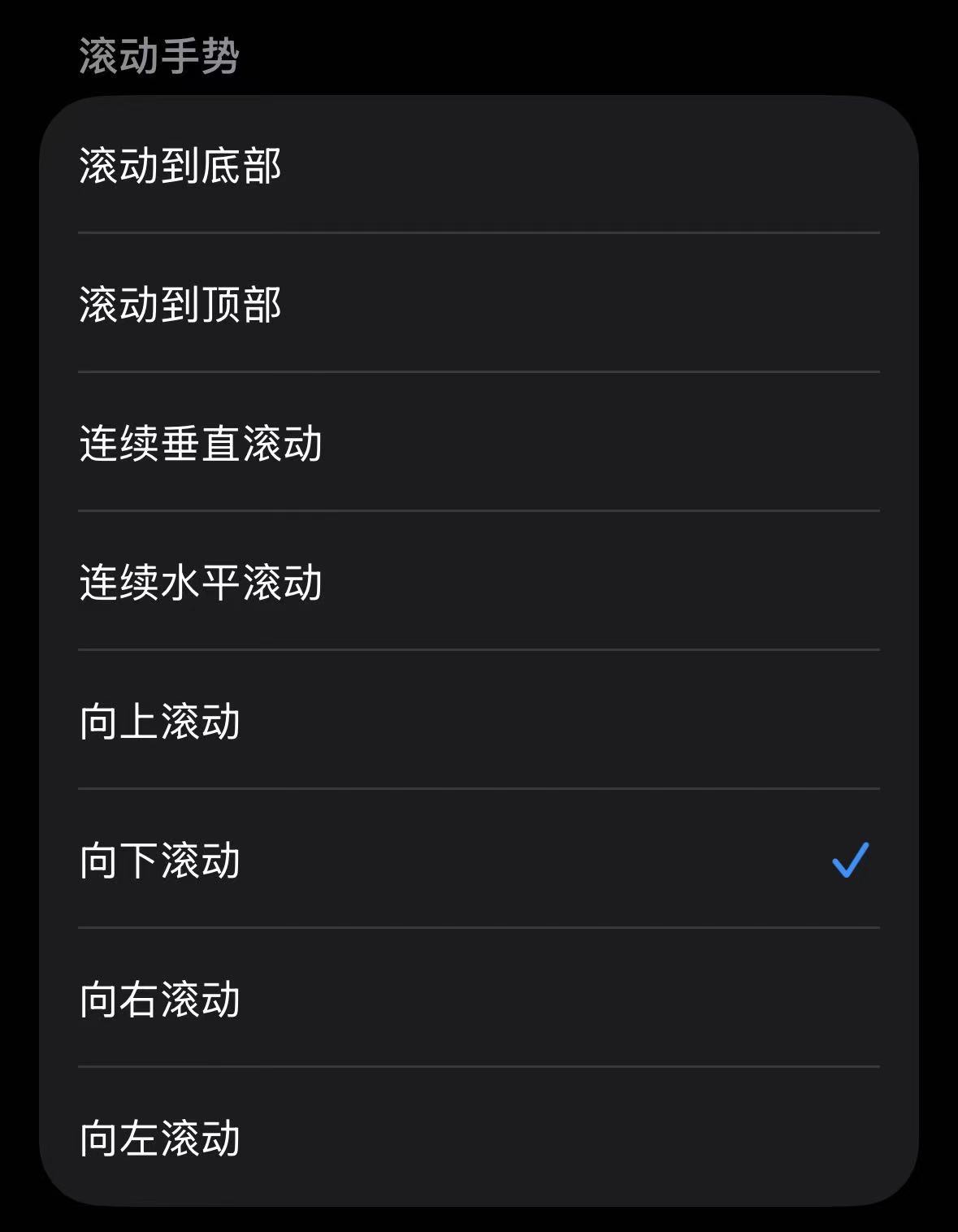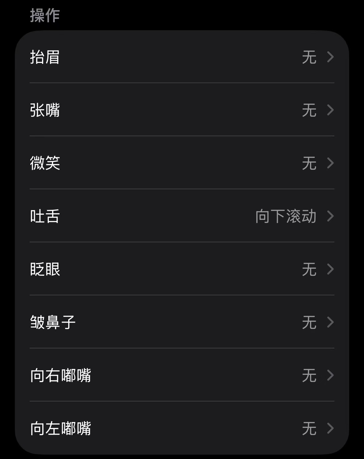 ⑤进入【吐舌】后,一直往下滑,找到“滚动手势”下的【向下滚动】(下图打勾那个)