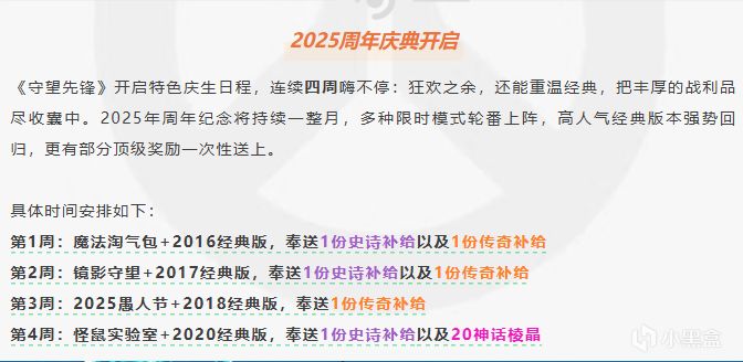 活动奖励包括藏品:全息守望先锋,骇灾周年头像,源氏和堡垒的藏品与头像,堡垒宠物鸟吊坠,花男传说皮肤,1金箱1紫箱。