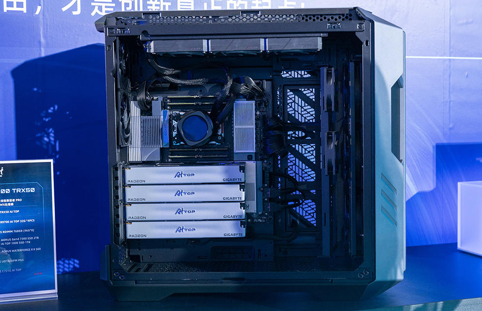 現場特別設立了“AI TOP系列專區”,技嘉展示了AI TOP 算力全家桶:搭載了AMD Ryzen Threadripper PRO 7965WX處理器、技嘉TRX50 AI TOP專業主板,以及技嘉專屬定製的四路AMD Radeon AI Pro R9700 32G高性能顯卡組合。該配置可提供超過500TFLOP/s的卓越計算性能,爲個人及企業創作者在人工智能應用、視覺設計、三維渲染等數字內容創作領域提供了創新性的解決方案與卓越體驗。