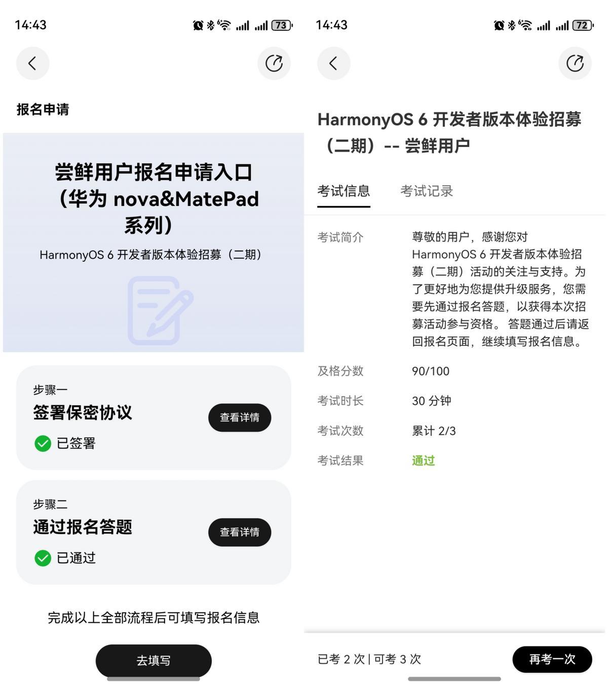 普通用户如何报名呢?打开手机上的应用市场,下载“开发者联盟”,登录并实名认证。打开“开发者联盟”,首页可以看到“Harmony OS 6开发者版本体验招募(二期)”,点击进入活动,然后选择“尝鲜用户报名”,然后选择自己的机型点击报名,需要签署保密协议并通过报名答题后才可以报名,填写相关的信息提交报名,然后就是等待官方审核,审核后推送升级,就可以下载安装体验了。