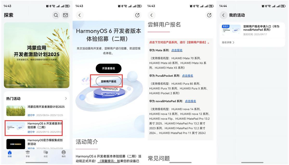 此次鸿蒙6用户尝鲜包括多款机型,覆盖中高端手机和部分平板。mate系列包括:mate70系列、mate60系列、mateX6系列、mateX5系列和mateXT。Pura系列包括:Pura80系列、Pura70系列和PuraX系列。nova系列包括:nova14系列、nova13系列和nova12系列。其他机型包括:Pocket2系列和多款平板。此次用户尝鲜招募报名截至9月22日上午10:00,招募共5个步骤:完成报名前置条件→填写报名信息→审核报名信息→通知审核结果→获得升级资源。