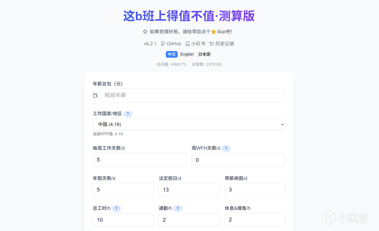 “这个b班上的值不值”是一款基于网页的时薪与工作性价比计算工具。用户通过输入薪资、工时、通勤时间、公司氛围等参数,工具会自动生成一个评分和评级,从而让用户直观感受这份工作的性价比。它由开发者在 GitHub 开源,任何人都可以免费使用或改进。