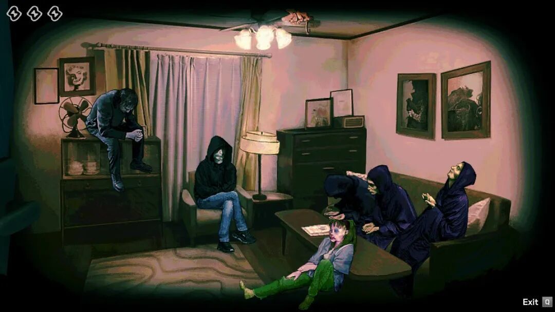 這個領袖,每隔一段時間,就會來敲門詢問你是否獨自在家。假如你家裏只有你一個人類,或回答它獨自在家,它就會破門而入,讓遊戲在主角恐懼的視野中結束。