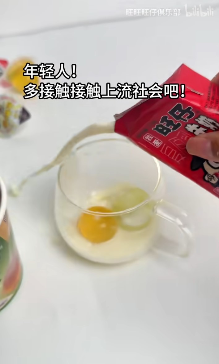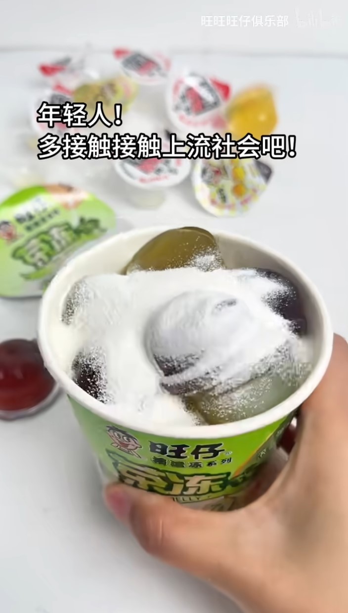 例如旺旺式 【反向 炫富】:滿滿一杯旺旺搖滾凍+撒滿果凍伴侶(粉包)+旺仔牛奶。