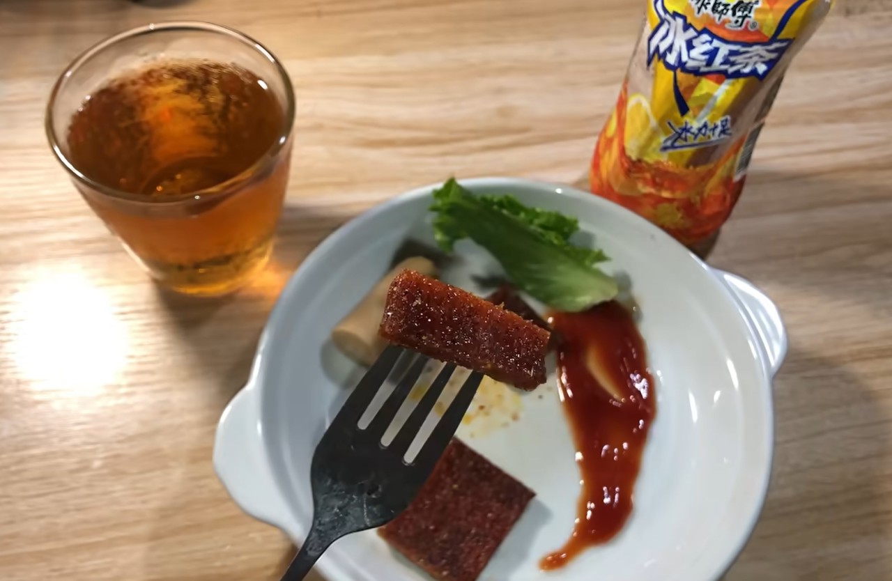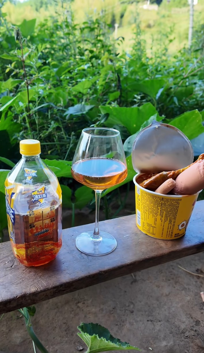 高腳杯盛冰紅茶,刀叉喫泡麪、親嘴燒、魔芋爽...