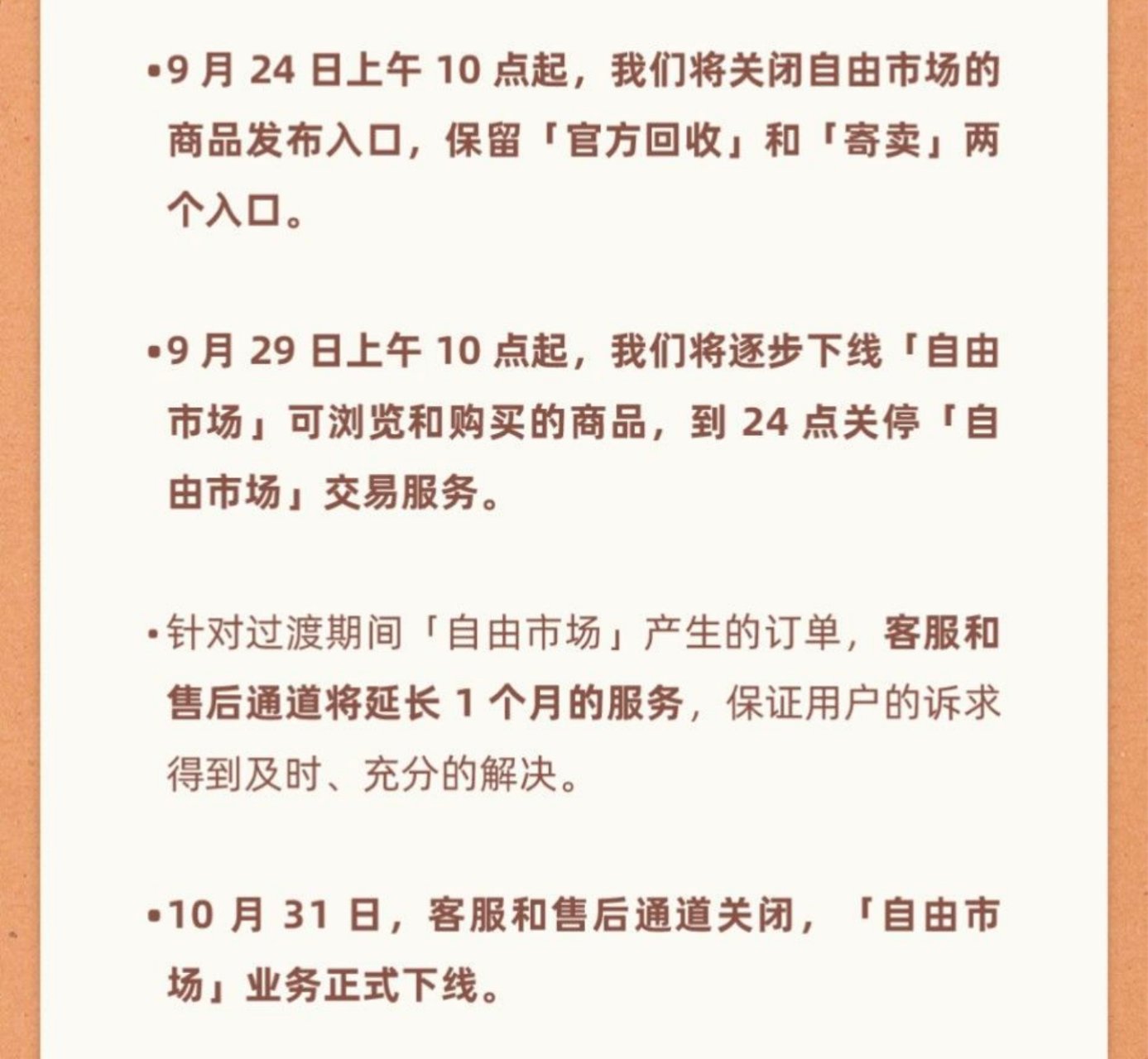 ▫針對過渡期間「自由市場」產生的訂單,客服和售後通道將延長 1 個月的服務,保證用戶的訴求得到及時、充分的解決。