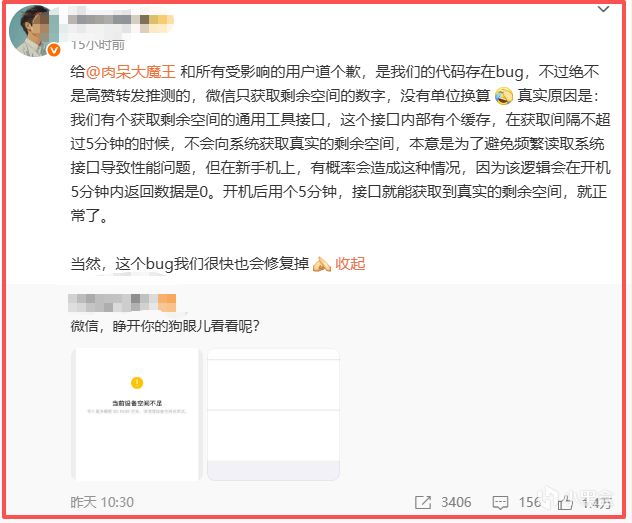 微信員工出來解釋了,說是微信代碼裏有個 Bug,會盡快修復,還跟受影響的用戶道了歉。他詳細說了原因,微信裏有個獲取設備剩餘空間的通用工具接口,這個接口內部有緩存機制。