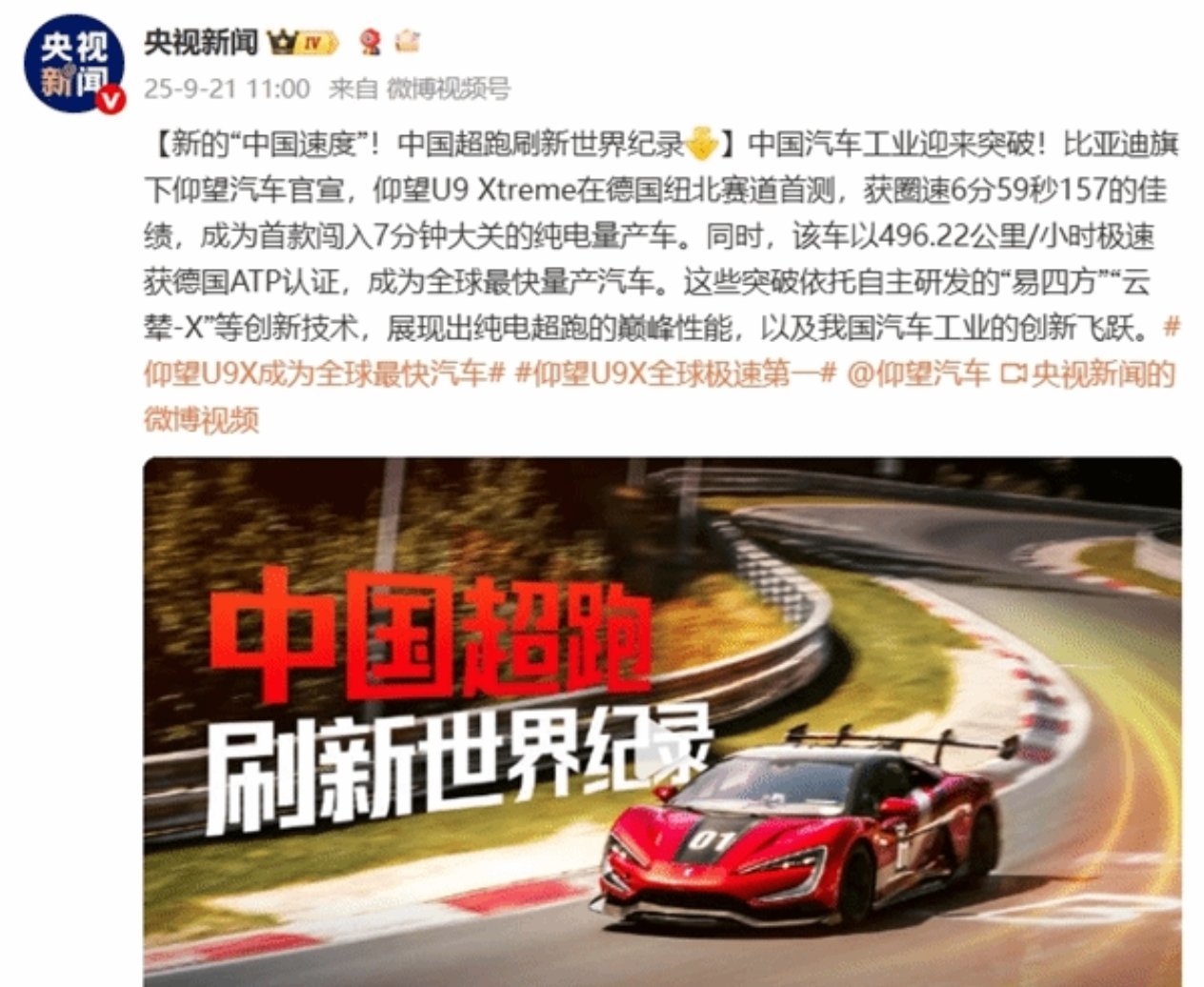 此次突破標誌着中國在高端純電性能車領域的技術實力已躋身全球頂尖行列,央視新聞亦對此進行了專題報道,肯定了中國汽車工業的創新飛躍。