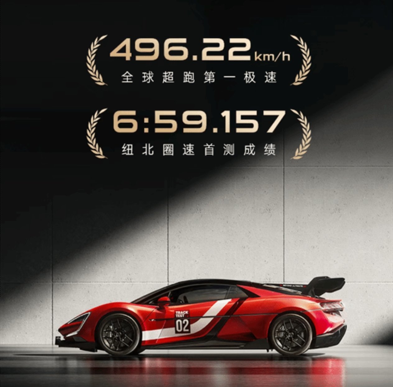比亞迪旗下仰望U9 Xtreme純電超跑近日在德國紐北賽道創下6分59秒157的圈速成績,成爲首款闖入7分鐘大關的純電量產車,此前這一紀錄由小米SU7 Ultra保持(7分04秒954)。同時,該車以496.22公里/小時的極速獲得德國ATP認證,登頂全球最快量產汽車榜單。