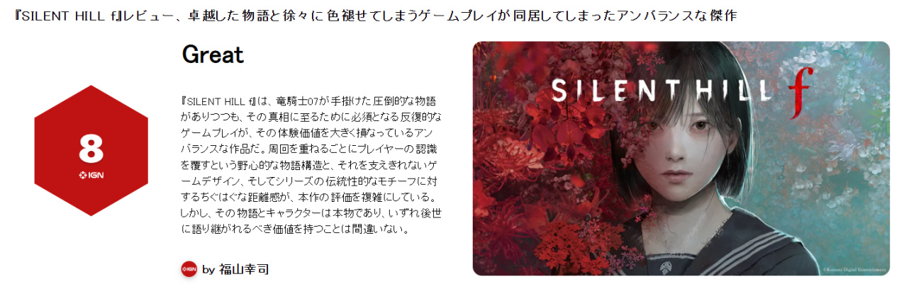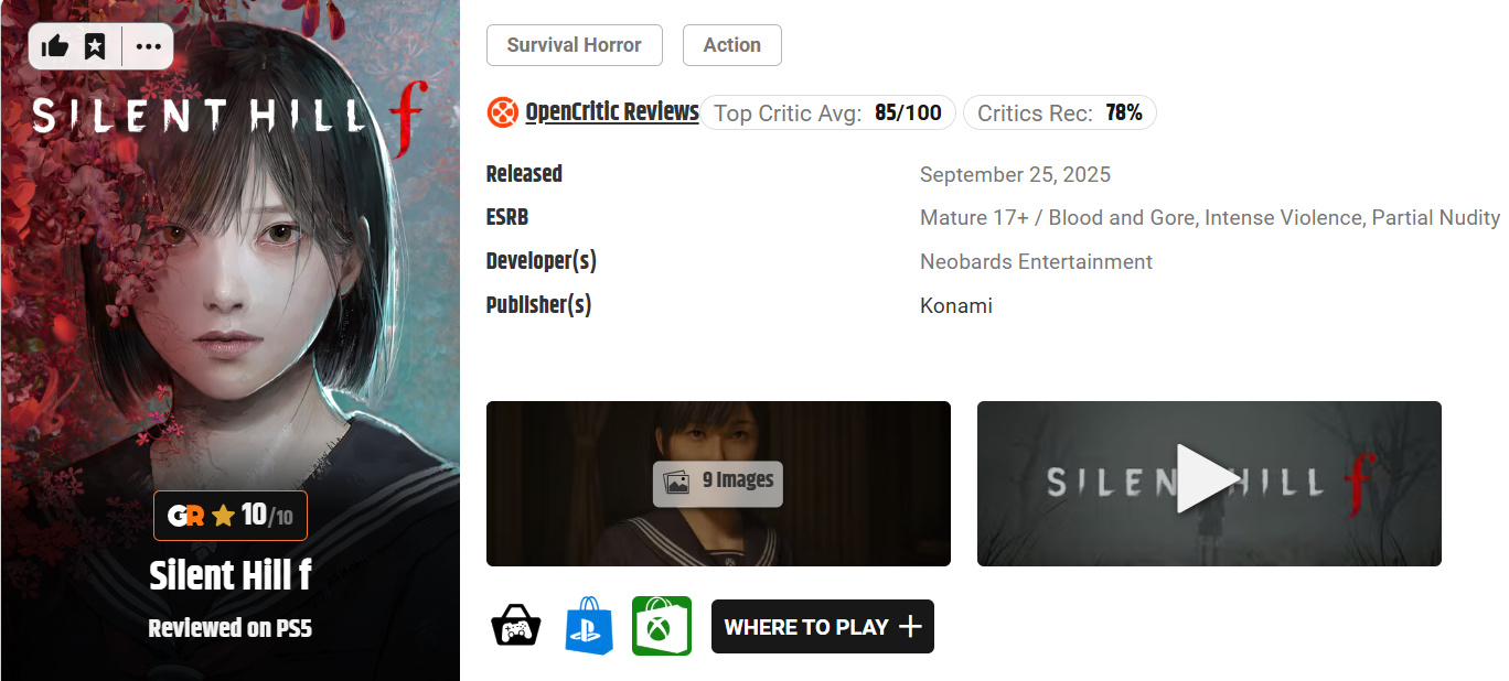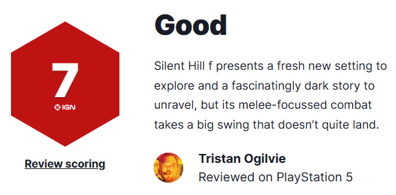 《寂静岭f》将正式于9月25日发售,根据评分网站Metacritic的整理,目前有61家媒体评分,多家媒体如Dexerto、Game Rant、Retcon评价游戏中足以令人恐惧的怪物与环境设计、精美的画面与良好的优化给出了满分的评价;IGN与Push Square则认为战斗系统未能达成预期效果给出了7分的评价。