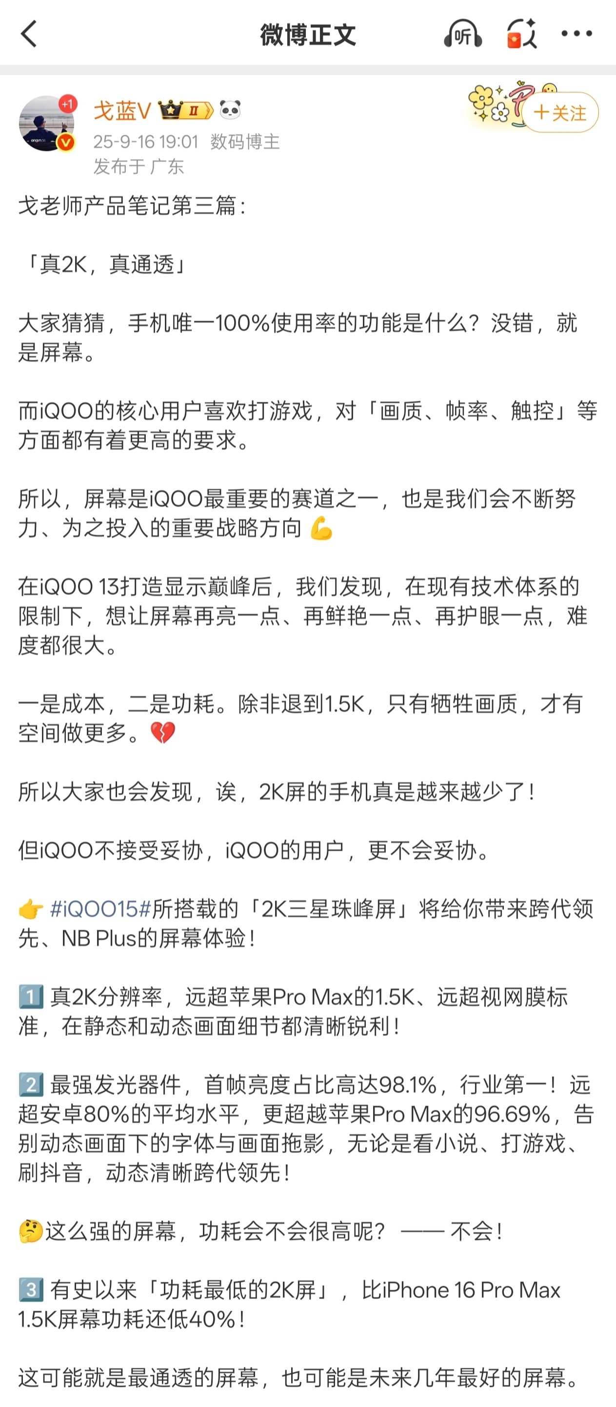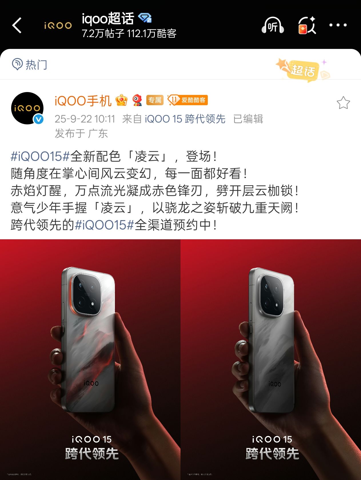 vivo小弟IQOO虽得等明天23号才能公布具体的新品发布时间,但在今天上午也稍微透露了下IQOO15的外观新配色——凌云而据戈蓝描述,iQOO15这次最大的升级点之一是找三星定制了一块超高素质的2K OLED屏幕,着重提升了亮度、功耗、黑白响应时间的表现。