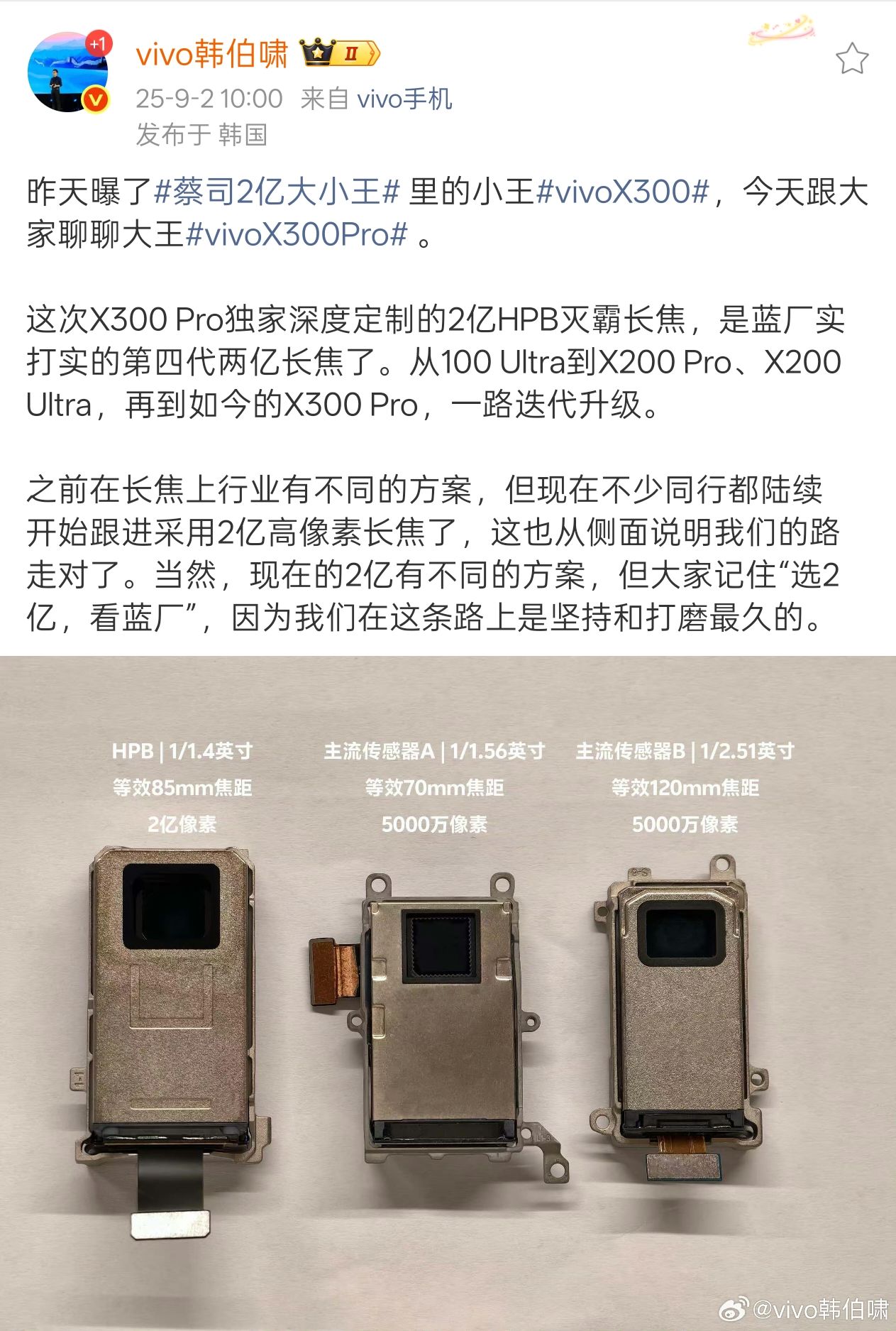 大家都这么热闹,vivo自然不会干等着。9月22日上午,vivo亦在微博宣布了自家新一代拍照手机—vivo X300系列将于10月13日晚七点发布,首发天玑9500处理器和索尼LYT–828传感器(Pro版主摄),标准版也会换装全新的两亿像素三星HPB主摄,统一配发京东方1.5K分辨率Q10plus发光基材oled屏幕。X300Pro还将首发双UFS4.1闪存技术,配备新的“寰宇”信号放大芯片和WIFI增强芯片,并升级全新的751440振感马达。