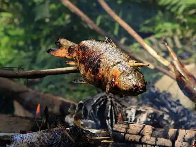 他歡呼大叫,以尖枝割開魚肚,洗去了魚腸,再找些枯枝,從身邊取出火刀、火石、火絨生了個火,將魚烤了起來。不久脂香四溢,眼見已熟,入口滑嫩鮮美,似乎生平從未喫過這般美味。片刻之間,將一條大魚喫得乾乾淨淨。