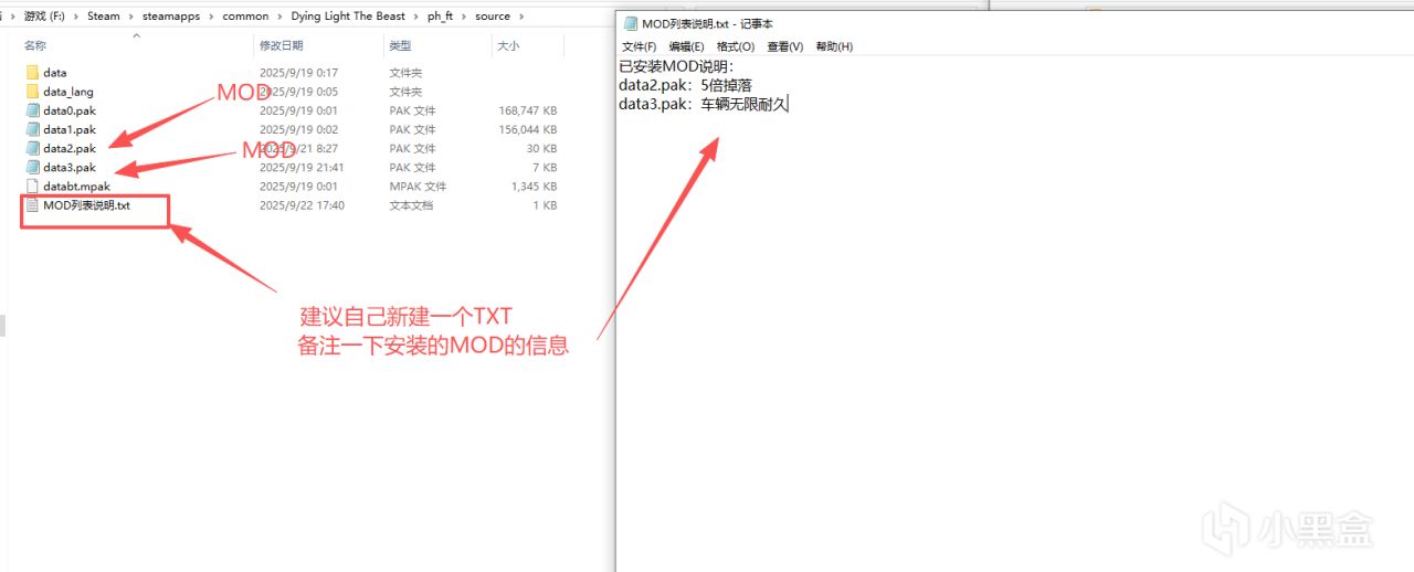 值得注意的是,游戏默认是有data0.pak和data1.apk文件的,所以你所安装的所以mod名称data后面的数字需要自己修改,可以依次排序,比如我安装了5倍材料掉落和车辆无限耐久,那就需要将解压出来的apk文件分别命名为data2.apk和data3.apk,如下图: