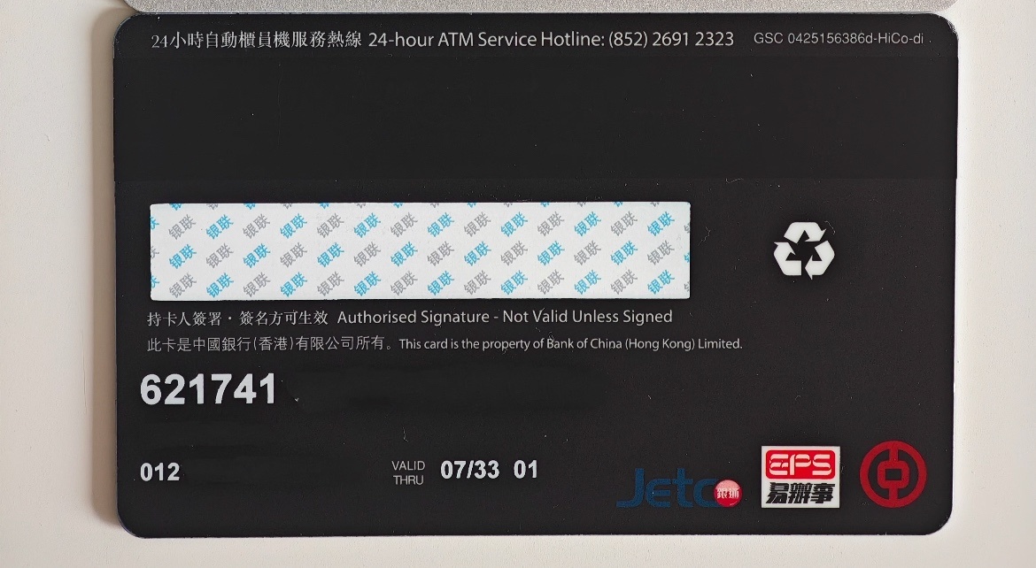 老版提款卡卡面選用頗爲經典的香港中銀大廈作爲背景,中銀大廈是世界著名華裔建築師貝聿銘先生的匠心傑作。其設計靈感源自竹子的「節節高升」,是香港島著名的地標建築,以此裝飾卡面頗具特色,極有辨識度。卡面正面全部採取凸印,提款卡號、戶口號、髮卡序號、持卡人姓名一覽無餘,略有臃腫。