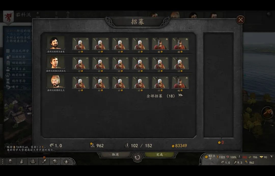受戰爭迷霧和低等級影響,加上地位、關係、聲望等限制,開局時無法像原版那樣直接從村莊招募士兵。在當前版本(6.5.9版本)中,除了酒館,幾乎沒有其他招兵途徑。因此初期很難形成規模部隊,連土匪都難以應對,不利於前期發育。