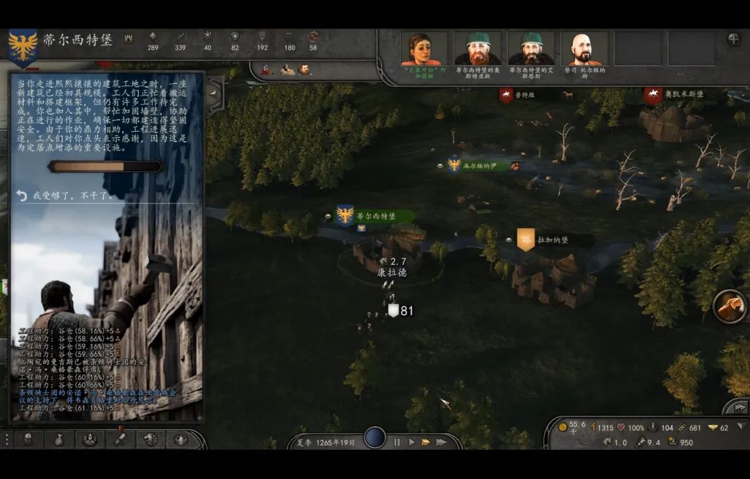 城中設施可以通過投入工具、木頭、粗鐵、黏土等材料來加速升級。加速升級時需攜帶一定數量的士兵幫忙幹活,但幹活會降低士兵士氣。幹完活後,可以把兵扔到城裏酒館喝酒恢復士氣,而且喝酒很便宜!值得注意的是:城堡可能因忠誠度過低而發生叛變。