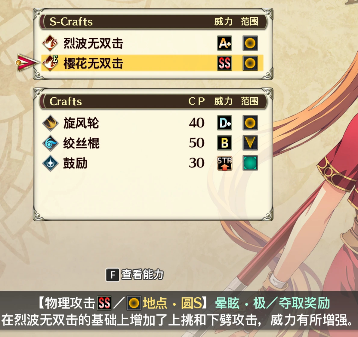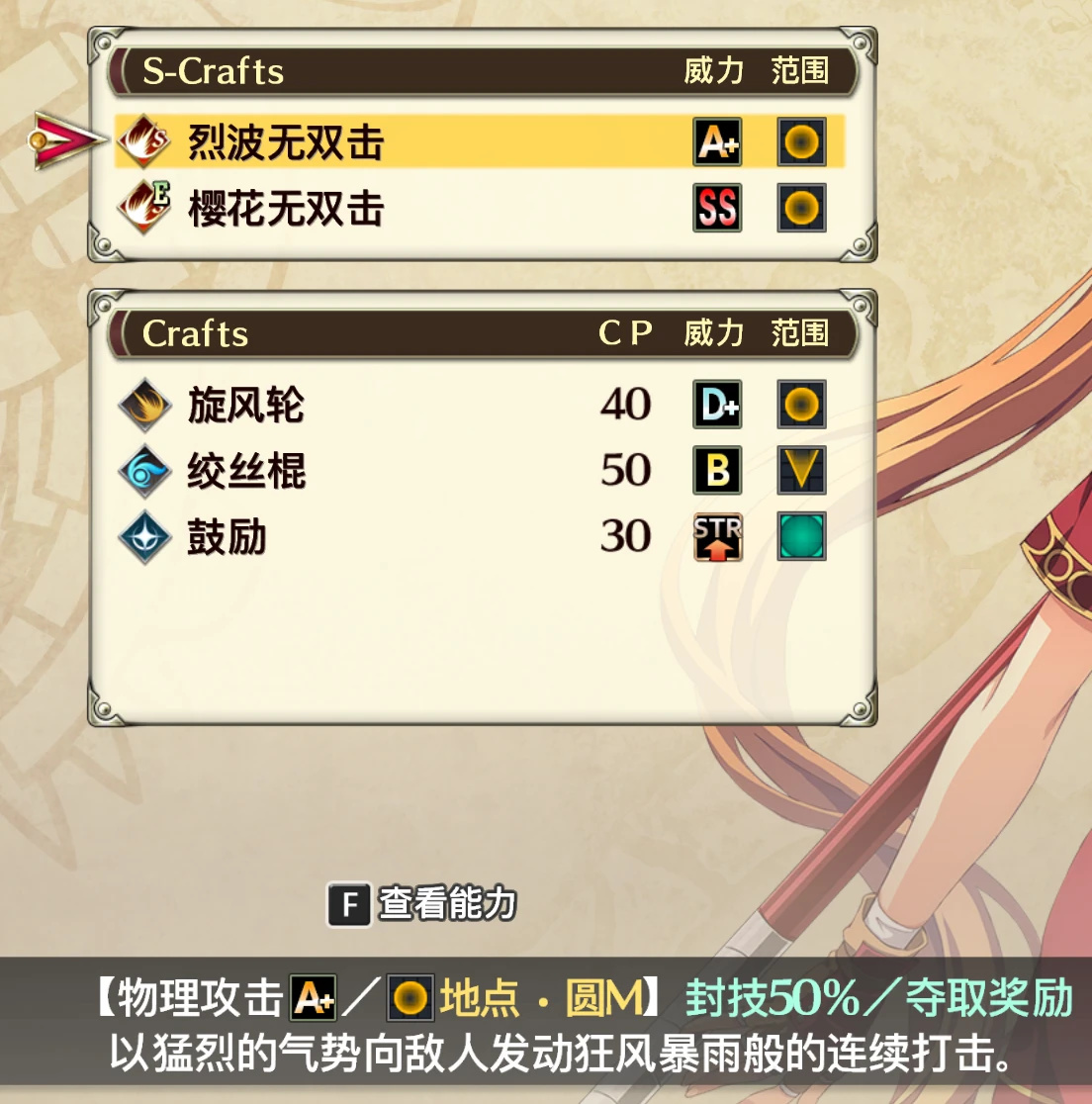比较陈旧的点在于《空之轨迹FC》里的战技,大多是攻击力×倍率,然后攻击范围不同。部分战技有解除驱动的效果。然后,部分战技附带一些“即死”、“延迟行动”的特效。