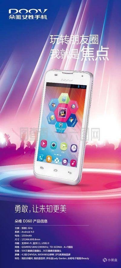 产品介绍:主打“女性市场”的手机品牌,早期的朵唯其实做的比较上心,功能机时代就考虑了女性用户手小、力量小的特点,把手机做的更适配女性手掌,按键力度低于一般手机。智能机时代,朵唯也做出过经由人工审核专门面对女性用户的应用市场,以及可以快速生成美妆照、大头贴的应用。但因为朵唯后期的创新局限于软件,核心功能被免费APP仿造以后就失去了竞争力。再后来朵唯卖身开始贴牌山寨机和老人机。