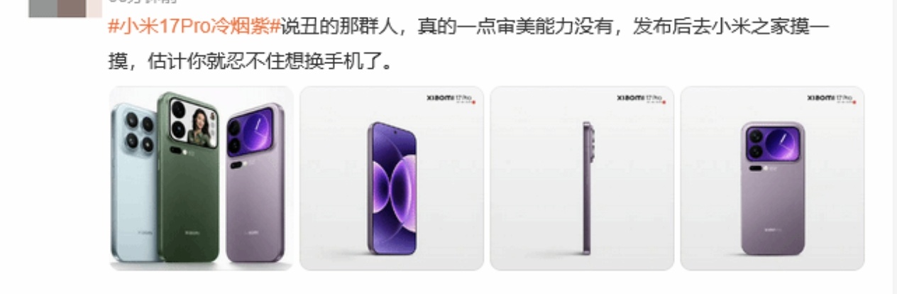 小米17 Pro系列的“冷烟紫”配色于2025年9月22日雷军公布后迅速登上微博热搜前三,其独特的雾面紫色设计与优雅气质引发网友广泛赞誉,被盛赞“颜值气质出众”。