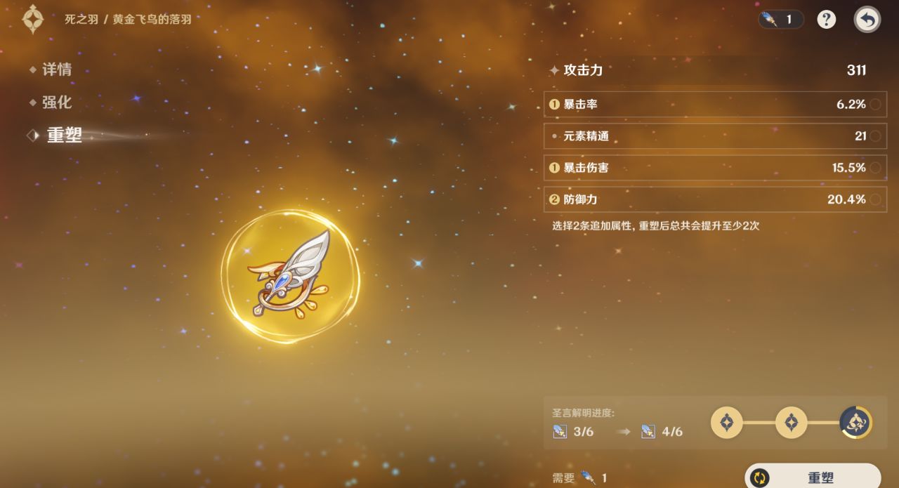 首先我们要理解羽毛是干嘛的?羽毛是用来重新分配词条强化,并且每用六根羽毛伴随着一次保底机制