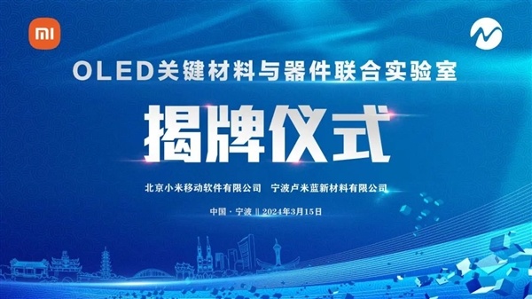 据悉,这次的新技术是小米与卢米蓝联合(宁波卢米蓝新材料有限公司)研发,双方早在2024年3月15日就成立了“小米-卢米蓝OLED关键材料与器件联合实验室”。