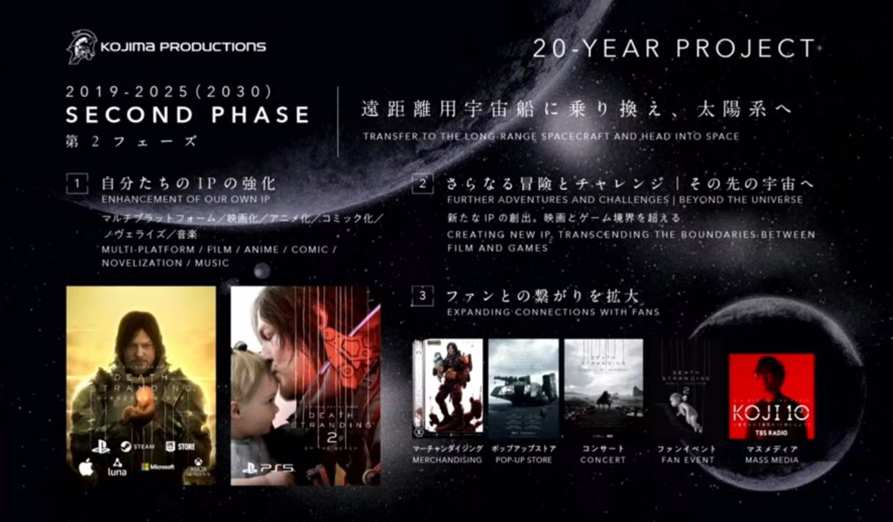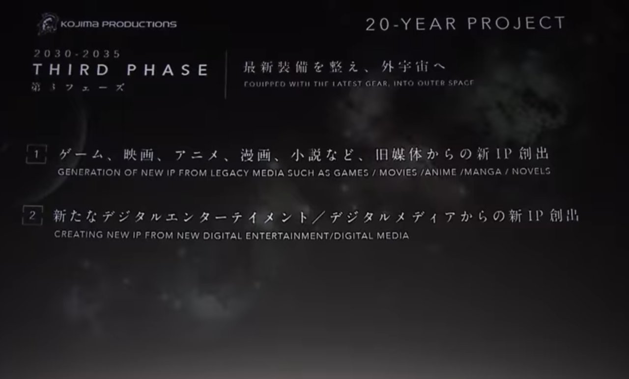 目前正考虑强化以及增强小岛工作室的IP,多平台/电影化/动漫化/漫画化/新小说化/音乐,扩大与粉丝的联系,转化为长距离太空飞船,进入太阳系。