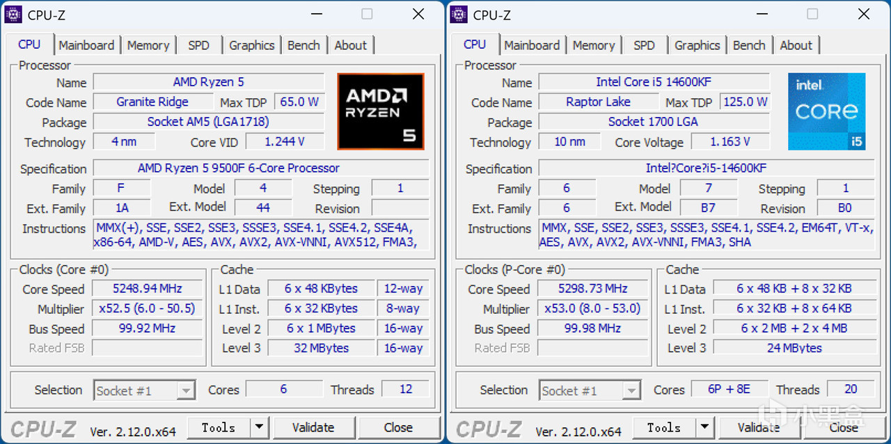 CPU-Z規格對比,可以看出,由於I5 14600KF多了8個小核心,所以銳龍5 9500F在規格上並不佔優勢。