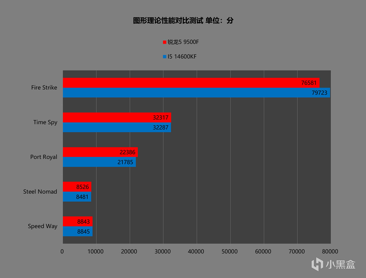 在3DMARK系列圖形理論性能測試中,銳龍5 9500F相較I5 14600KF,有3個項目取得了領先,有2個項目有所落後。