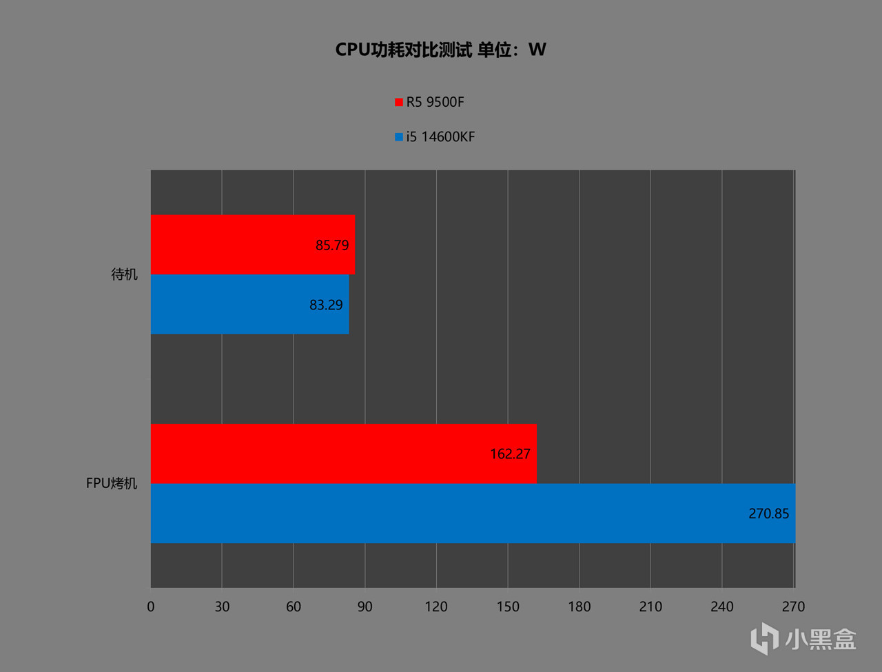 功耗對比測試,二者的待機功耗相差不大,但烤機功耗,銳龍5 9500F要遠低於I5 14600KF。