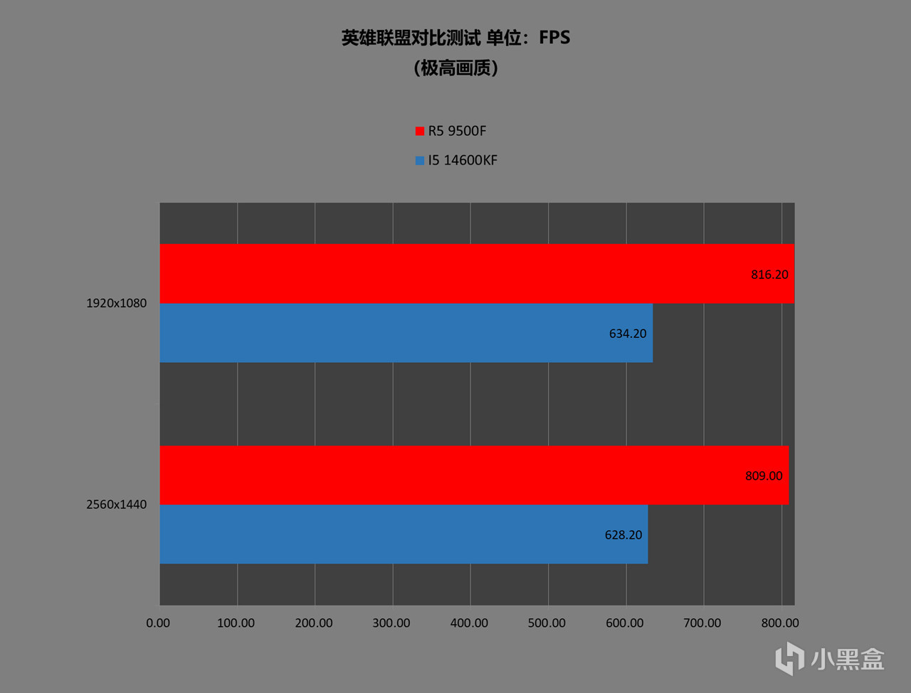 在《英雄聯盟》測試中,銳龍5 9500F相較I5 14600KF,在兩個分辨率下均有大幅度的領先,其中1080P分辨率下領先了182.00幀,領先比率28.70%;1440P分辨率下領先了180.80幀,領先比率28.78%。