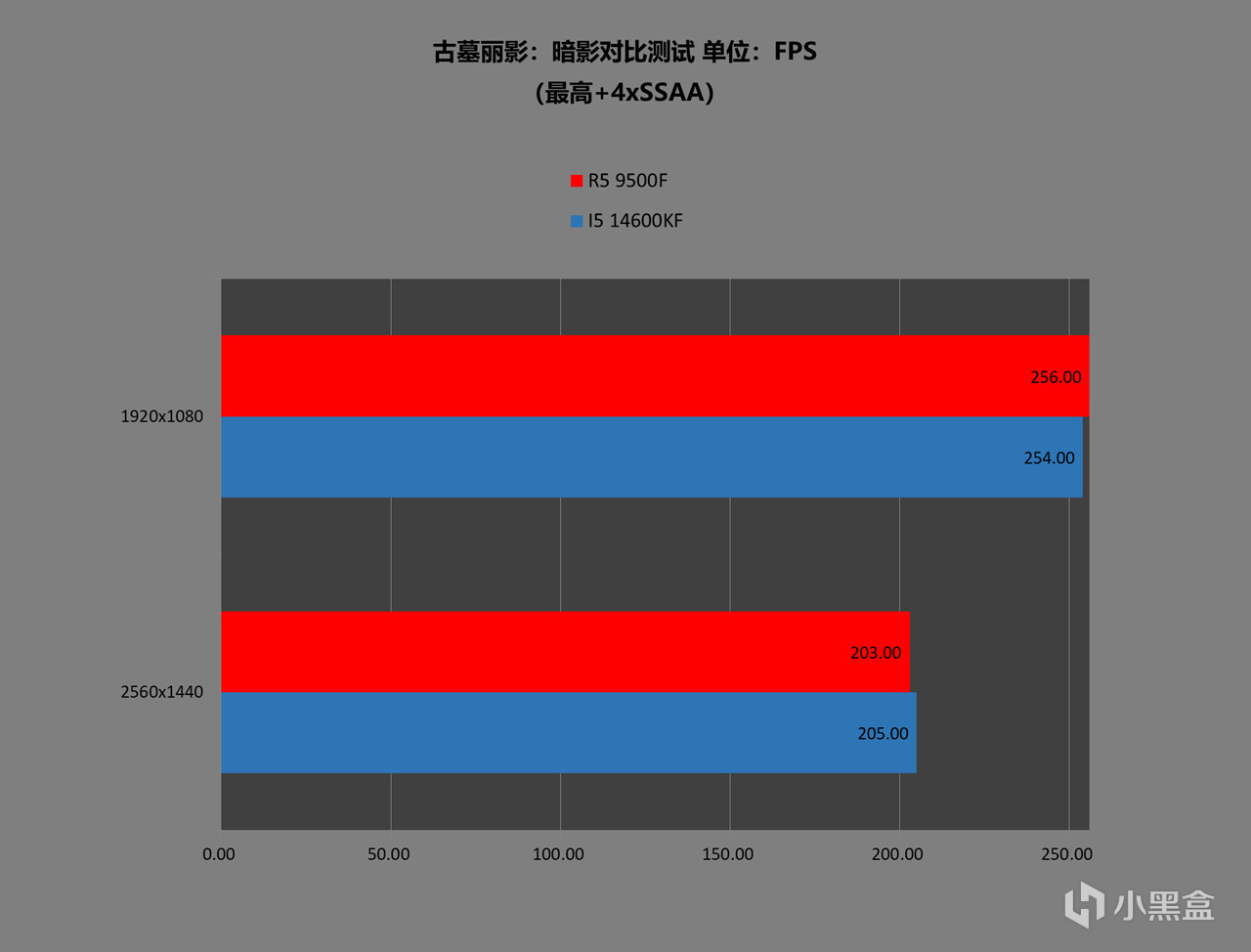 在《古墓麗影:暗影》測試中,銳龍5 9500F相較I5 14600KF,在兩個分辨率下互有勝負,其中1080P分辨率下領先了2.00幀,領先比率0.79%;1440P分辨率下落後了2.00幀,落後比率0.98%。