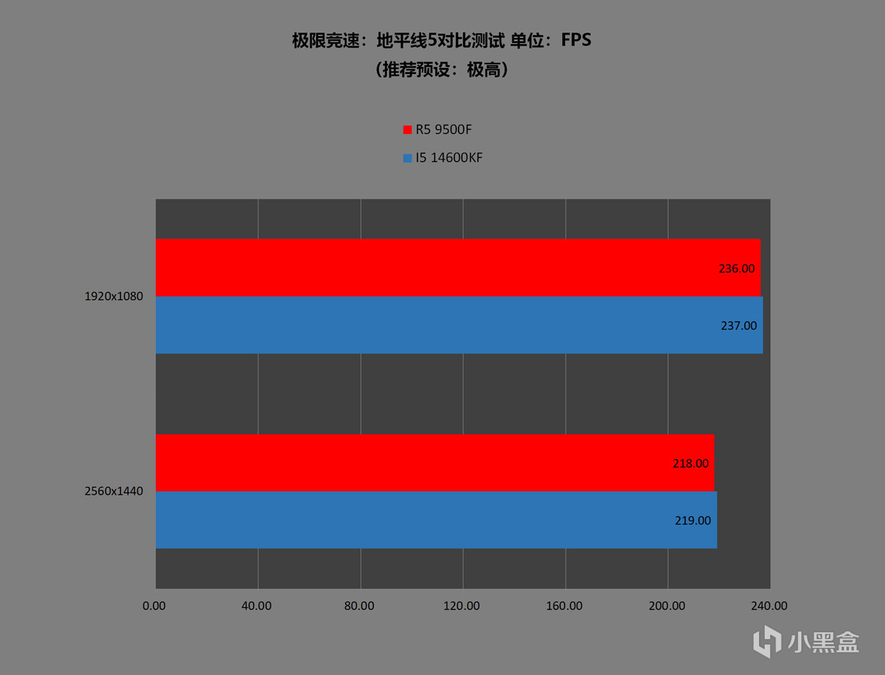 在《極限競速:地平線5》測試中,銳龍5 9500F相較I5 14600KF,在兩個分辨率下均有小幅度的落後,其中1080P分辨率下落後了1.00幀;1440P分辨率下落後了1.00幀。