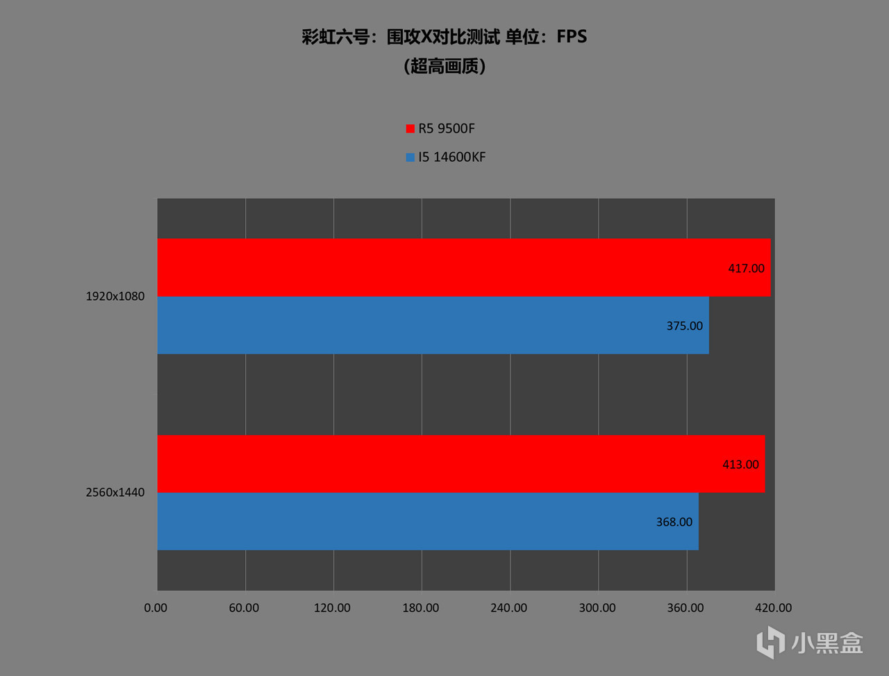 在《彩虹六號:圍攻X》測試中,銳龍5 9500F相較I5 14600KF,在兩個分辨率下均有大幅度的領先,其中1080P分辨率下領先了42.00幀,領先比率11.20%;1440P分辨率下領先了45.00幀,領先比率12.23%。