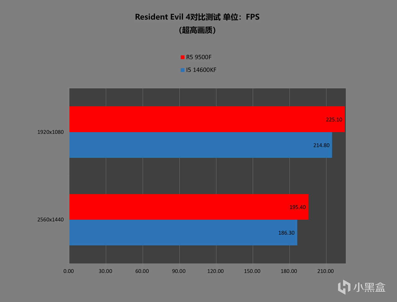 在《Resident Evil 4》測試中,銳龍5 9500F相較I5 14600KF,在兩個分辨率下均有較爲明顯的領先,其中1080P分辨率下領先了10.30幀,領先比率4.80%;1440P分辨率下領先了9.10幀,領先比率4.88%。