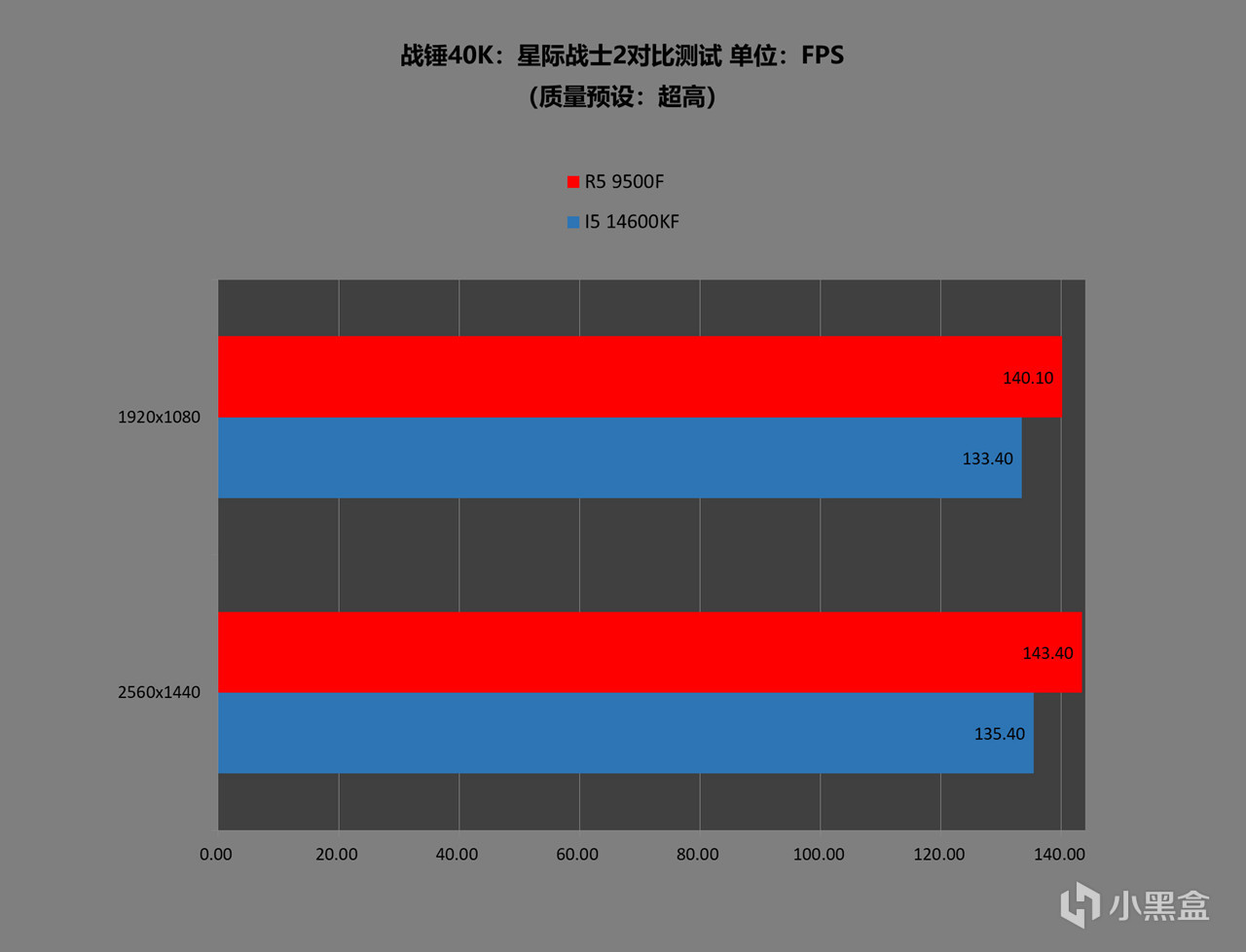 在《戰錘40K:星際戰士2》測試中,銳龍5 9500F相較I5 14600KF,在兩個分辨率下均有較爲明顯的領先,其中1080P分辨率下領先了6.70幀,領先比率5.02%;1440P分辨率下領先了8.00幀,領先比率5.91%。