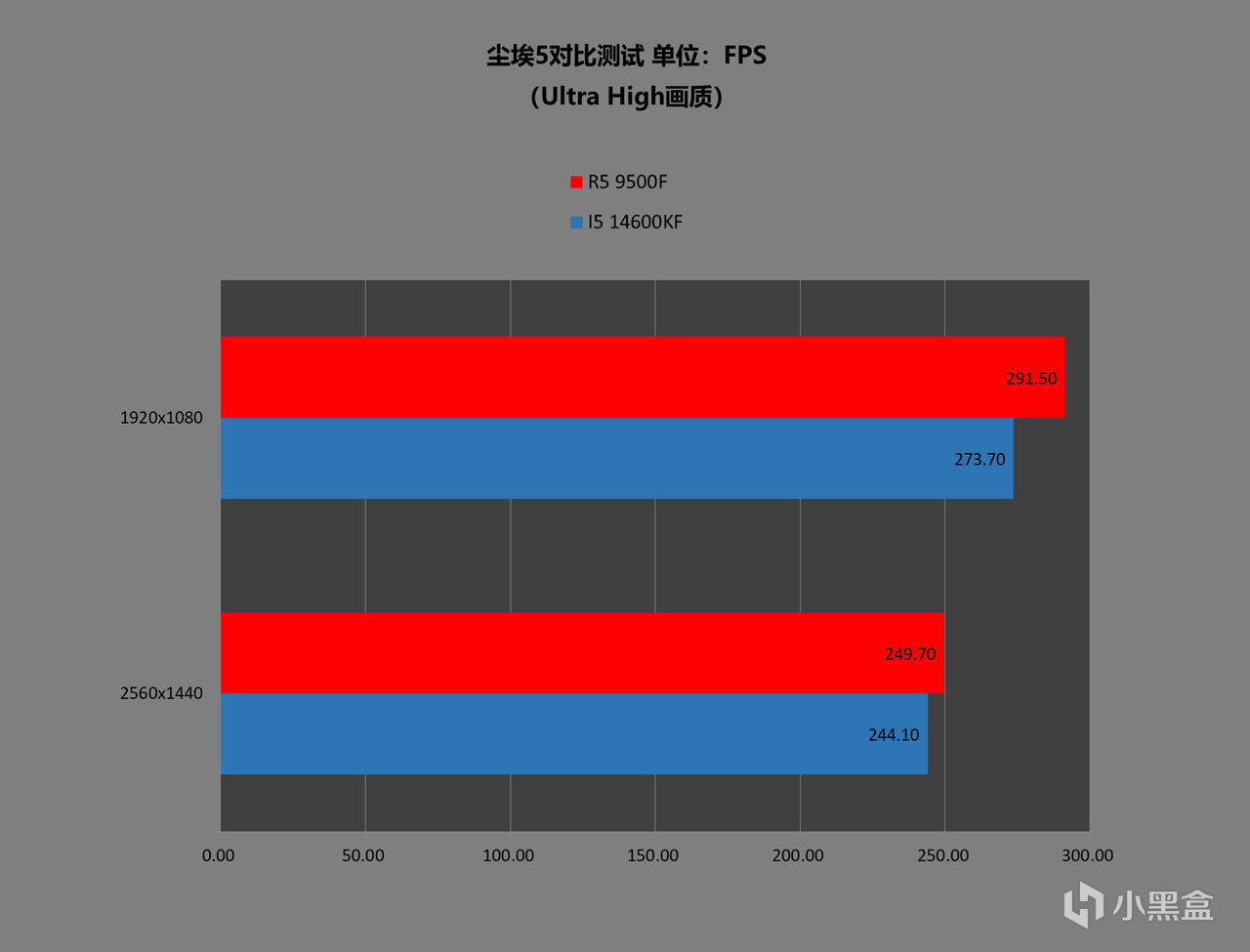 在《塵埃5》測試中,銳龍5 9500F相較I5 14600KF,在兩個分辨率下均有較爲明顯的領先,其中1080P分辨率下領先了17.80幀,領先比率6.50%;1440P分辨率下領先了5.60幀,領先比率2.29%。