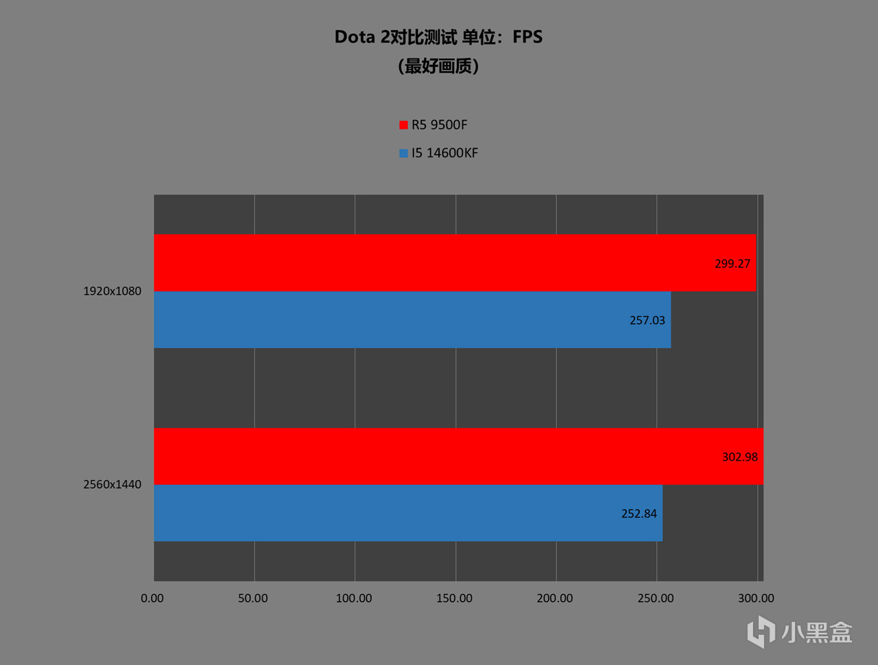 在《DOTA 2》測試中,銳龍5 9500F相較I5 14600KF,在兩個分辨率下均有大幅度的領先,其中1080P分辨率下領先了42.24幀,領先比率16.43%;1440P分辨率下領先了50.14幀,領先比率19.83%。
