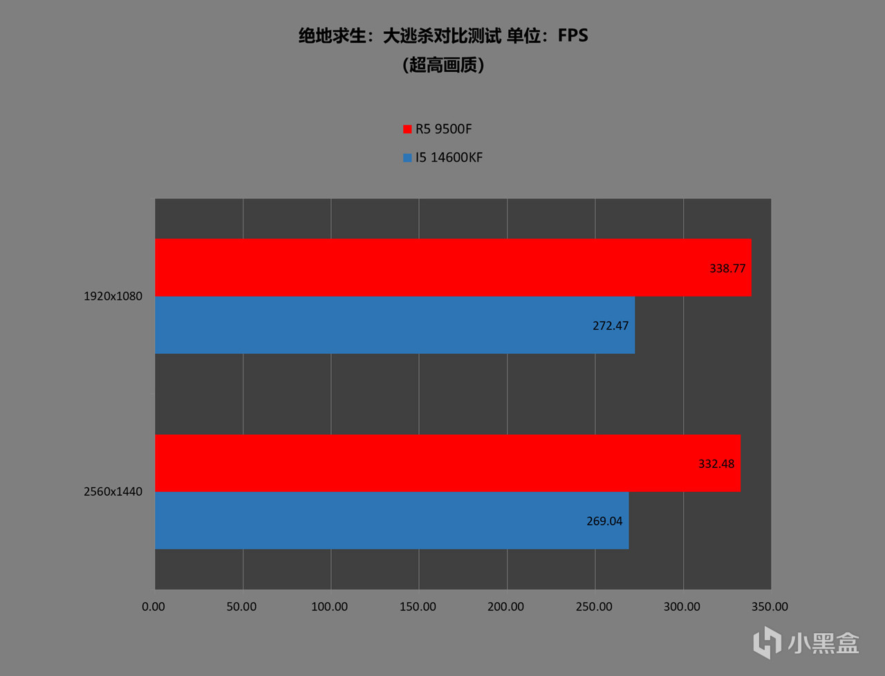在《絕地求生:大逃殺》測試中,銳龍5 9500F相較I5 14600KF,在兩個分辨率下均有大幅度的領先,其中1080P分辨率下領先了66.30幀,領先比率24.33%;1440P分辨率下領先了63.44幀,領先比率23.58%。