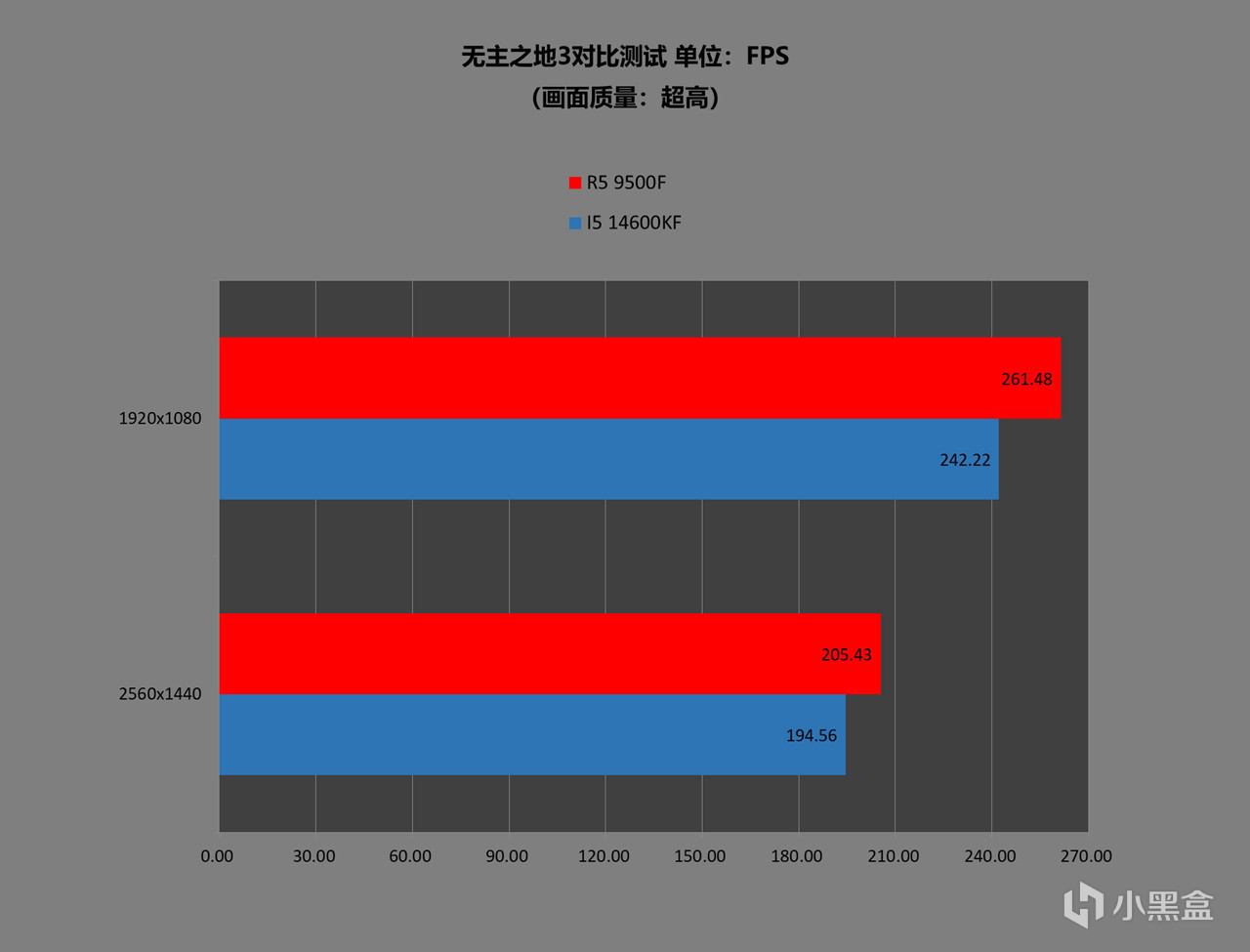在《無主之地3》測試中,銳龍5 9500F相較I5 14600KF,在兩個分辨率下都有較爲明顯的領先,其中1080P分辨率下領先了19.26幀,領先比率7.95%;1440P分辨率下領先了10.87幀,領先比率5.59%。