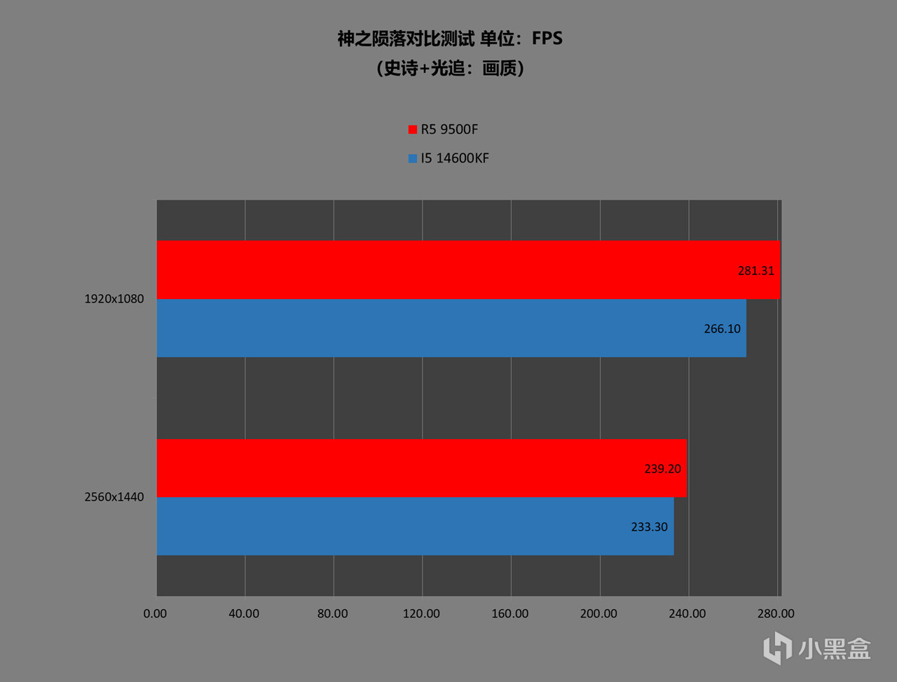 在《神之隕落》測試中,銳龍5 9500F相較I5 14600KF,在兩個分辨率下均有較爲明顯的領先,其中1080P分辨率下領先了15.21幀,領先比率5.72%;1440P分辨率下領先了5.90幀,領先比率2.53%。