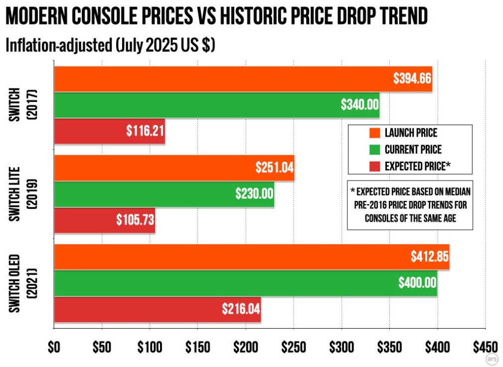 據Ars Technica對美國數十款主要遊戲機發佈的歷史價格數據和降價時機的分析,如今遊戲主機的價格比基於歷史定價趨勢預期的要高出數百美元。